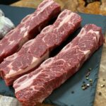 Cut across the bone, 1.5 inches thick. Nicely marbled, very flavourful, moist and tender when braised.