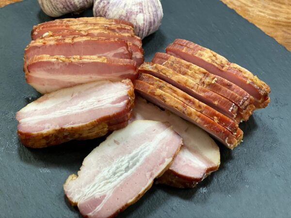Cured and double smoked in house, thick sliced, half the length of our regular bacon. The perfect size for sandwiches and burgers.