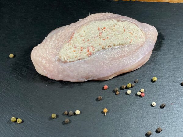 A single skin on chicken breast stuffed with our house made Neptune Stuffing: Imitation Crab Meat, Shrimp, Onions, Garlic, Spices, Mayonnaise and Cream Cheese.