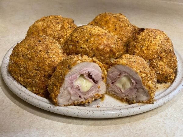 Glenwood Black Forest Ham and Havarti cheese inside of a boneless skinless thigh chicken thigh, rolled in our almond breading. Gluten free and Keto friendly. Bake at 350F until the internal temperature reaches 165F.