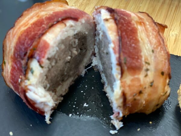 A single tenderized chicken breast rolled around our house made Keto Sausage meat and wrapped in our Glenwood bacon.
