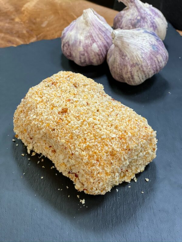 A single tenderized chicken breast wrapped around our Roasted Garlic Cream Cheese & Bacon stuffing and rolled in our seasoned panko.