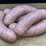 Our house made Bacon Cheeseburger Beef sausages are made in dinner size natural hog casings, approximately 4 per pound. Gluten Free.